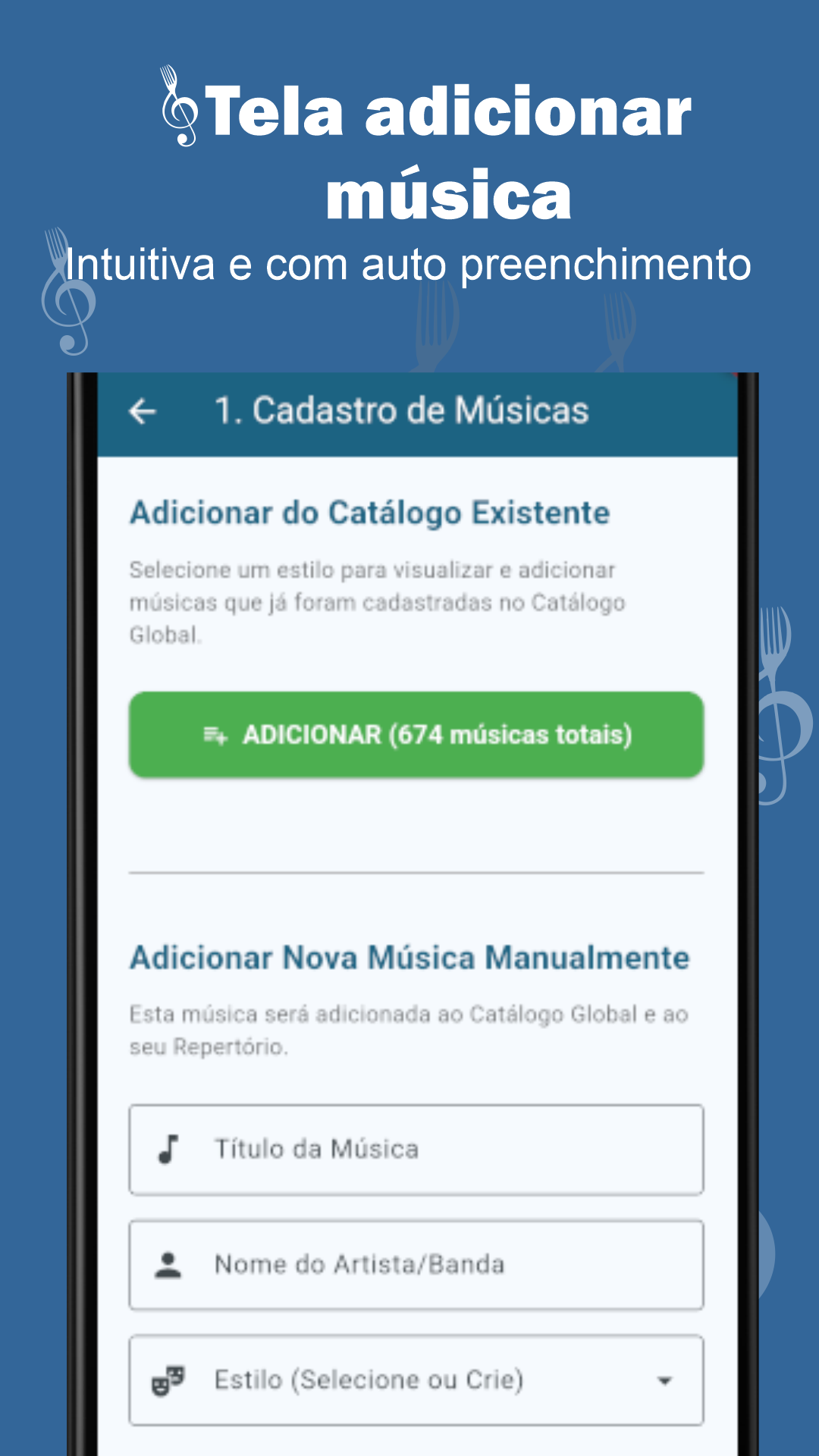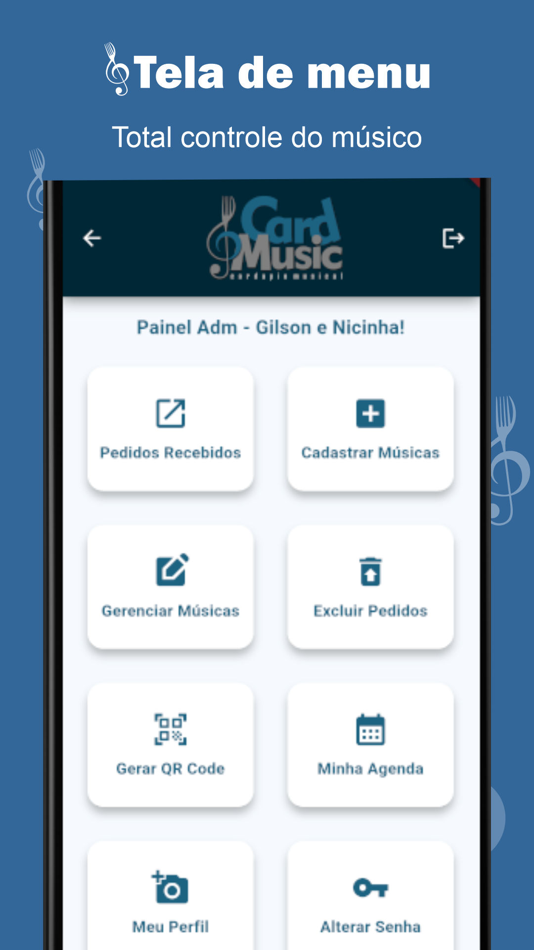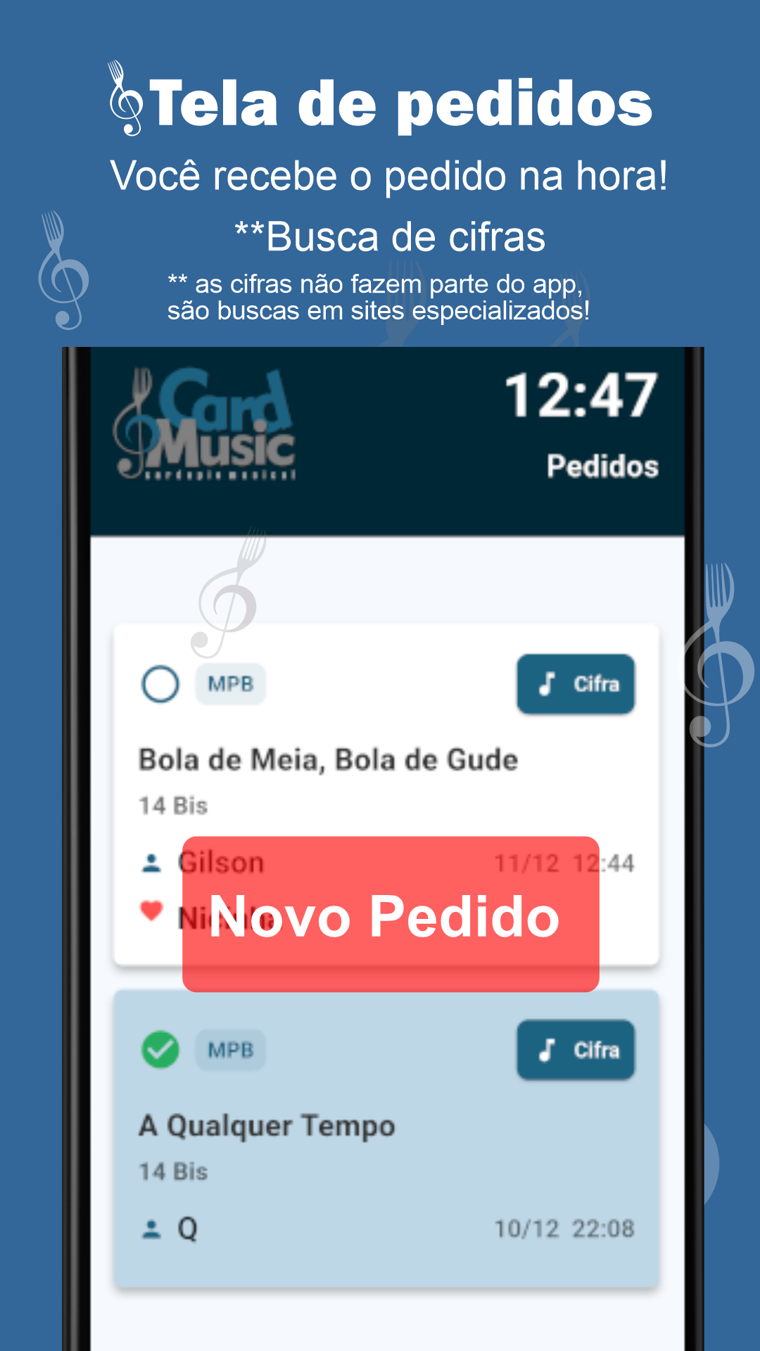 Gerencie seu repertório, receba muitos pedidos de músicas na hora e com apenas 1 clique, abra a cifra para executar a música. Você não precisa mais perder tempo procurando a cifra na sua pasta. Se ainda não tiver a cifra no seu dispositivo, ela ira abri online. Salve as cifras online no seu dispositivo, edite e faça backup das cifras. Incentive seu público a pedir músicas do seu repertório! Exclua os pedidos no final do evento para que as músicas retornem ao seu repertório. Não haverá pedidos repetidos!